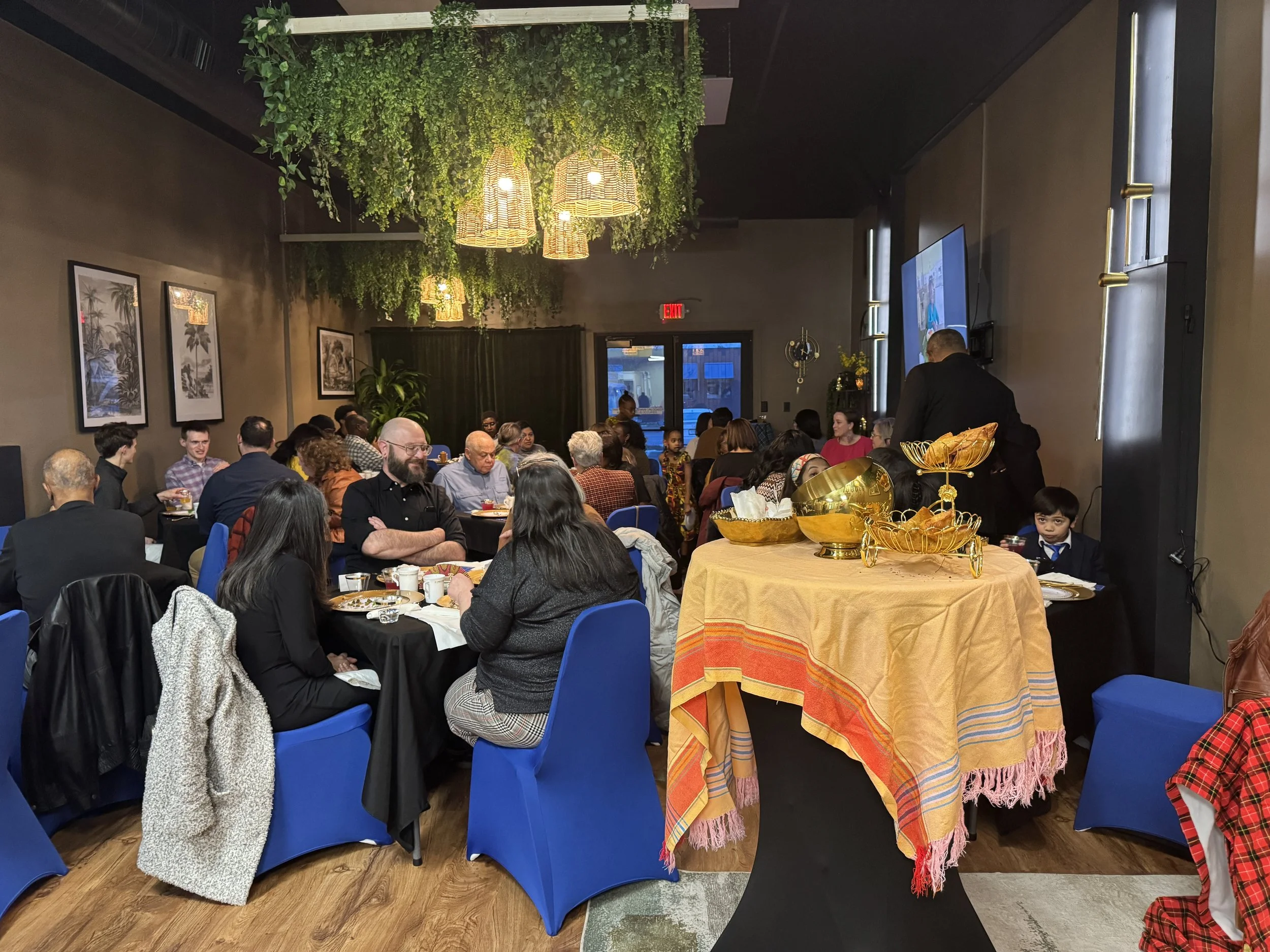 Appetizers included samosas and curated drinks. The main course featured chapati, golden rice, kakuchoma, creamed spinach, cabbage, kombuchari, and chicken — plate after plate of food that left very few dishes going back anything but empty. Dessert was mendazi — traditional Kenyan donuts — served alongside chai, which is a staple in Kenya but something most people in the room had never tried (the reactions were immediate and audible).